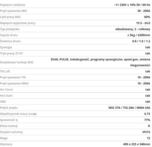 SPARTUS EasyMIG 217DP to nowoczesny, inwertorowy półautomat spawalniczy skonstruowany w oparciu o tranzystory IGBT. Umożliwia: synergiczne spawanie MIG/MAG z podwójną pulsacją, synergiczne spawanie MIG/MAG z pulsacją, spawanie MIG/MAG w trybie synergicznym, spawanie MIG/MAG w trybie ustawień ręcznych, spawanie TIG Lift, spawanie elektrodą otuloną MMA. Dodatkowo urządzenie, dzięki możliwości zmiany biegunowości spawania, umożliwia spawanie drutem samoosłonowym bez gazu. Maksymalny prąd spawania dla metod MIG/MAG/TIG/MMA wynosi 200A. Urządzenie zasilane jest z sieci jednofazowej 230V.