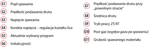 - Inductance – regulacja indukcyjności spawania – kontrola szerokości lica i głębokości wtopienia (MIG/MAG), ograniczenie ilości odprysków spawalniczych,