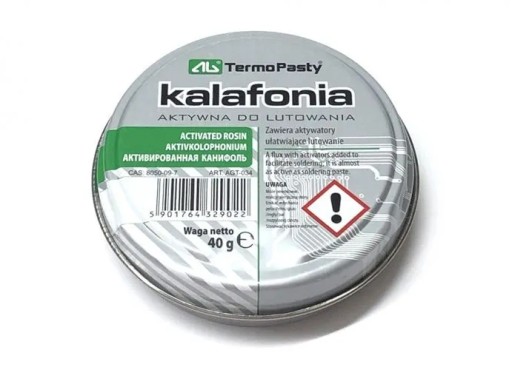 Kalafonia firmy AG Termopasty jest stosowana jako baza do topnika wzorcowego, gdzie stanowi 25% roztworu w alkoholu izopropylowym.