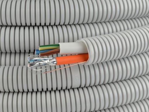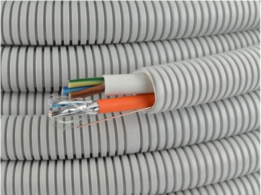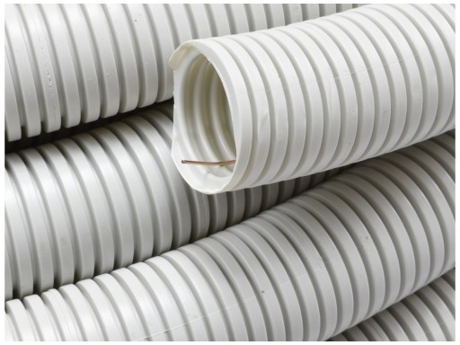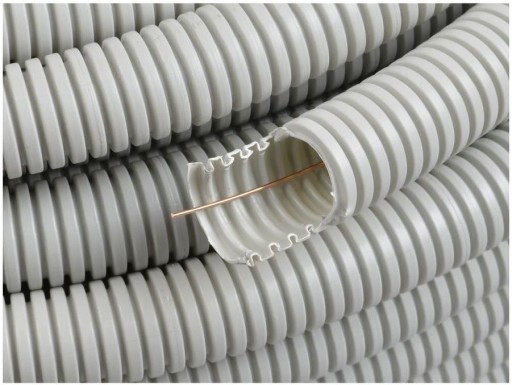 Rura instalacyjna, karbowana, giętka, nie rozprzestrzeniająca płomienia wykonana z PCV w kolorze szarym (RAL7035), ze stalowym pilotem ułatwiającym przeciąganie przewodów.