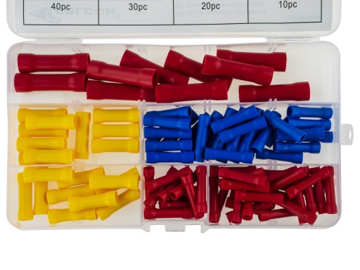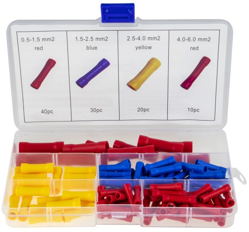 Zestaw - komplet 100 szt. wysokiej jakości złączy izolowanych, do łączenia odizolowanych końcówek przewodów. Prawidłowo zaciśnięte złączki zapewniają poprawny kontakt połączonych przewodów. Zapewniają stabilność połączeń wibracyjnych i zmniejszają prawdopodobieństwo zwarcia. Połączenie wykonuje się poprzez zaciśnięcie praską końcówki kablowej na przewodzie.
