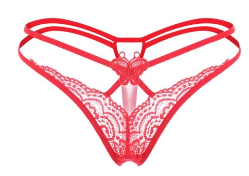 Oferuję seksowne stringi z głębokimi wycięciami, wykonane z uroczej koronki z figurką motyla i prześwitującej strukturze. Ozdobne paski dodają uroku odsłaniając biodra.