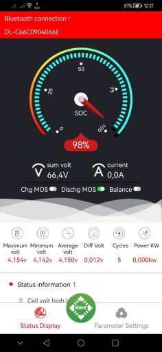 Po połączeniu BMS z modułem BT w naszym telefonie, mamy możliwość ciągłego monitoringu temperatury, napięcia na poszczególnych sekcjach, prądu i innych parametrów.