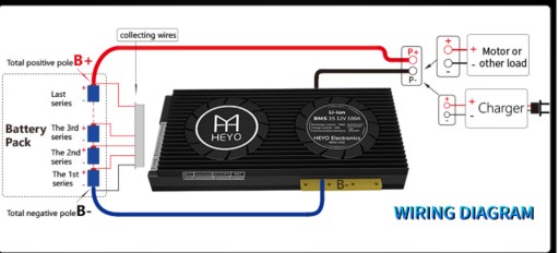- Dużym ułatwieniem jest podłączenie obciążenia jak i ładowanie przez wspólną parę przewodów wychodzącą z BMS-a