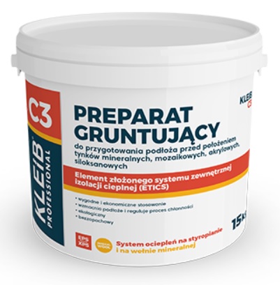 KLEIB C3 jest podkładowym preparatem gruntującym, przeznaczonym do przygotowania podłoża przed położeniem tynków mozaikowych oraz cienkowarstwowych tynków mineralnych, akrylowych, siloksanowych i silikonowych w systemie zewnętrznej izolacji cieplnej z wyprawami tynkarskimi KLEIB oraz systemie KLEIB W.