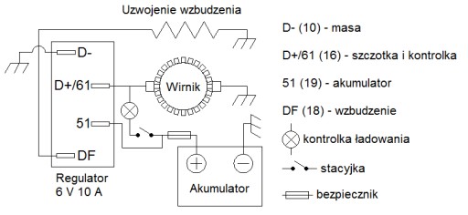 Podobnie oznacza, że uzwojenie wzbudzenia jest zasilane "+" z regulatora, a jego drugi koniec jest zwarty do masy.