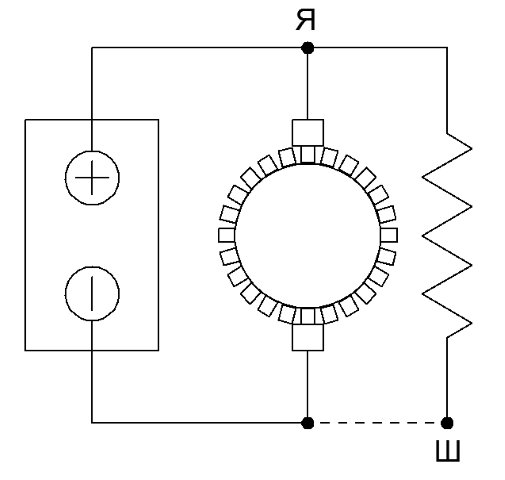 Prądnicę należy wyjąć z motocykla i zasilić ją przez kilka sekund jak pokazano to na rysunku obok (będzie się obracać jak silnik elektryczny). W praktyce należy zewrzeć zacisk Ш z obudową prądnicy i zasilić "-" z akumulatora. Do zacisku Я należy podłączyć "+". Cała operacja jest bardzo prosta, tylko groźnie brzmi.