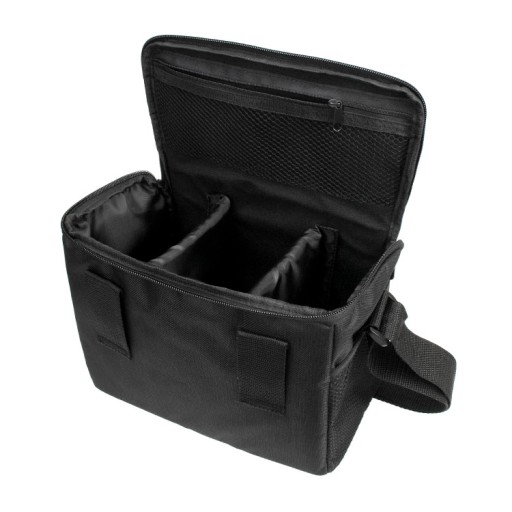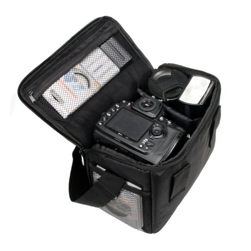Torba pomieści lustrzankę cyfrową, dodatkową lampę reporterską, dodatkowy obiektyw, przewody, karty itp.