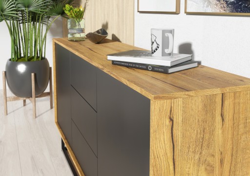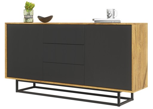 Oryginalna komoda w stylu loftowym, której konstrukcja wykonana jest z wysokiej jakości płyty laminowanej o grubości 15 mm gwarantującej wytrzymałość. Mebel posiada dwoje drzwi oraz trzy szuflady. Zarówno drzwiczki, jak i szuflady otwierają się przy wykorzystaniu systemu push to open. Cały mebel posadowiony został na metalowej ramie w kolorze czarnym, co zdecydowanie nadaje mu niebywałego charakteru. Oryginalny design mebla sprawia, że zachwyci on niemal każdego gościa Twojego domu.