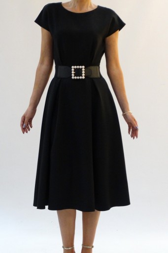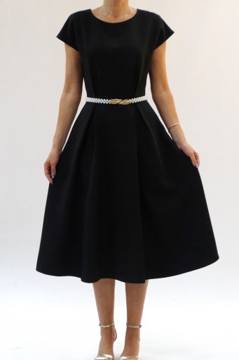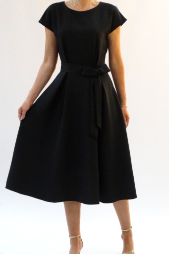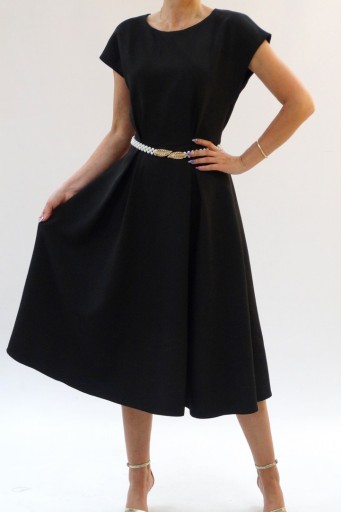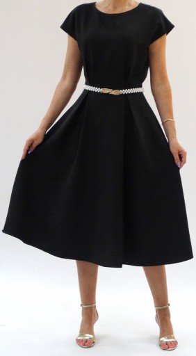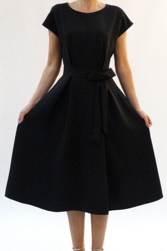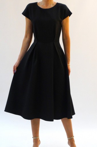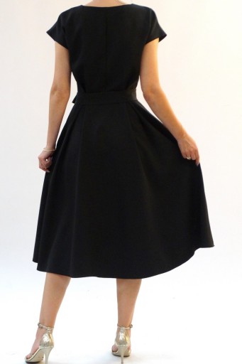 Dół sukienki rozkloszowany z pionowymi kontrafałdami które optycznie wyszczuplają sylwetkę.