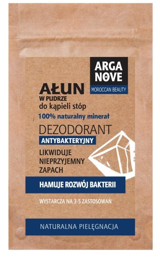 Ałun to sproszkowany minerał górski – naturalny, bezzapachowy dezodorant.Dodany do kapieli wodnej wykazuje właściwosci dezodoryzujace. Tworzy na powierzchni skóry warstwę zabezpieczajacą, która pozwala zachować swieżośc nawet do 12 godzin. Zapobiega rozwojowi bakterii, odpowiedzialnych za powstawanie nieprzyjemnego zapachowi. Nie zatyka porów, dzięki czemu umożliwia przezskórne usuwanie toksyn.