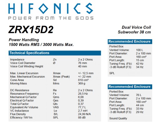 Subwoofery marki HiFonics z serii Zeus ZRX to nowa propozycja w segmencie mocnych przetworników. Oprócz popularnych rozmiarów 25-30-38 cm ( 10-12-15 cali ) wprowadzono również mniejsze rozmiary - 16,5 i 20 cm ( 6,5 i 8 cali ). Pozwala to na uzyskanie dobrego basu w mniejszych samochodach, bez konieczności poświęcania całego bagażnika. Już pierwszy rzut oka przekonuje, że mamy do czynienia z solidnymi subwooferami - odlewane aluminiowe kosze, szerokie wzmacniane górne zawieszenie czy membrana z nieprasowanej pulpy papierowej gwarantują oczekiwany efekt.