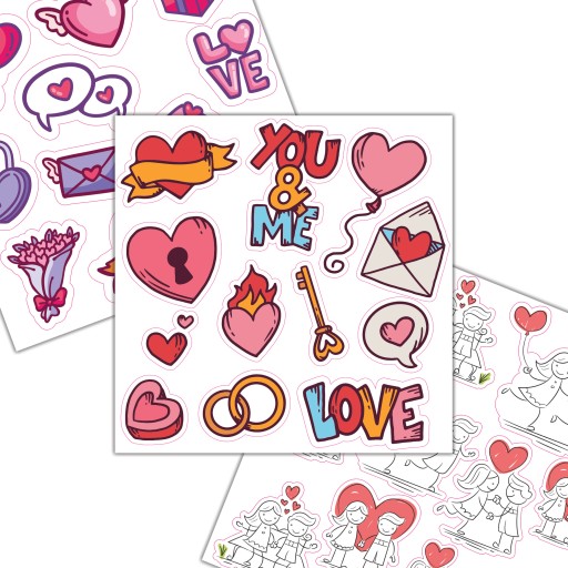 Różowe obrysy dookoła naklejek wyznaczają linię cięcia naklejek.