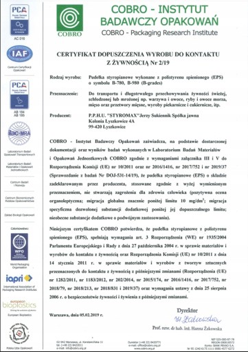 Na produkowane pudełka styropianowe posiadamy Świadectwo Jakości Zdrowotnej (Certificate Of Health Quality), dopuszczające do transportu w tych pudełkach żywności, suplementów dietetetycznych i produktów leczniczych w opakowaniach własnych.