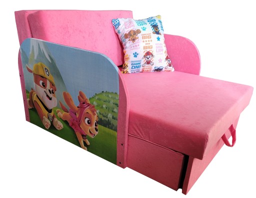 Jest to tapczanik dziecięcy o nowoczesnym wzornictwie. Tkanina - PRINT -PSI PATROL na jednym boczku (zdj. lewy bok)- Proszę o zaznaczenie w wiadomości na którym boczku ma być tkanina ze wzorem. Tło tkaniny ze zdjęciem psów może nieznacznie się różnić, w zależności od dostępności w hurtowni.