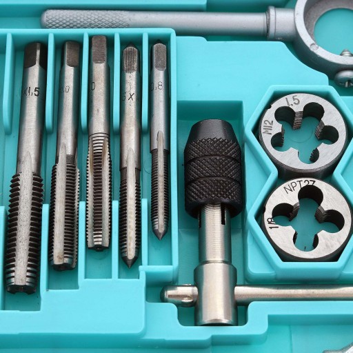 Zestaw przeznaczony do naprawy połączeń gwintowych różnego kalibru, przy pracach instalacyjnych, w warsztatach ślusarskich itp.