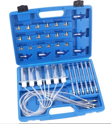 Zestaw tester do sprawdzania wtryskiwaczy Common Rail. Przyrząd przeznaczony jest do diagnostyki wtryskiwaczy w silnikach Diesla, maksymalnie 6-cio cylindrowych, wyposażonych w system zasilania paliwem Common Rail. Pozwala na szybką i łatwą diagnozę wtryskiwaczy na podstawie pomiaru ilości paliwa odprowadzanego na przelewie wtryskiwaczy. Pozwala łatwo ocenić ewentualne uszkodzenia, zabrudzenia czy nieszczelności wtryskiwaczy. Zestaw jest wyposażony w 24 szt. adapterów do systemów Bosch, Siemens, Denso, Delphi.