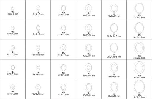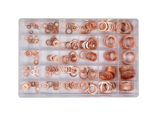 Zestaw 300 sztuk podkładek miedzianych typu miękki. Zestaw zawiera rozmiary od 5x9x1 mm do 28x36x2 mm. Całość umieszczono w wygodnym opakowaniu typu "sortownik".