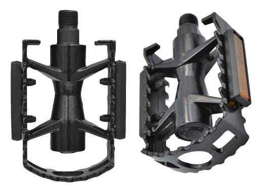 Pedały aluminiowe MTB, łożyska kulkowe, z odblaskami, wymiary 106 x 77 mm, ośka stalowa 9/16 cala, kolor: czarny.