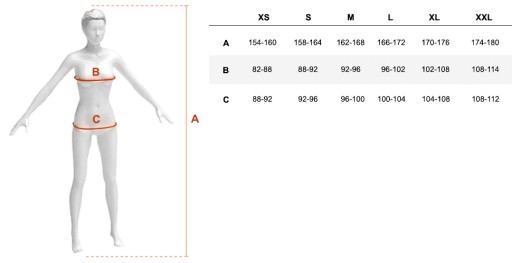 - Rozmiar M - Wzrost: 162-168, Obwód klatki piersiowej: 92-96, Obwód bioder: 96-100