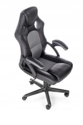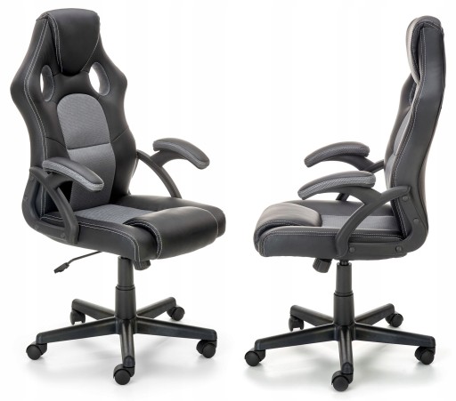 Fotel biurowy, obrotowy, gabinetowy lub młodzieżowy, gamingowy. Wewnętrzna część siedziska i oparcia w kolorze szarym tapicerowana tkaniną membranową (materiał oddychający), tapicerka w kolorze czarnym z gładkiej eco skóry. Tapicerowane podłokietniki i podstawa jezdna wykonane z mocnego tworzywa. Design fotela podkreślą wkontrastowe przeszycia.