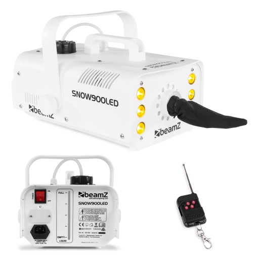o mocy 900W marki BeamZ z podświetleniem LED. Idealna na domowe imprezy, zabawy, animacje, ale też do klubów, dyskotek czy do zastosowań scenicznych. Efektem tego urządzenia nie są klasyczne płatki śniegu, tylko lekko unosząca się, zwiewna piana, ale nie tak skumulowana jak w klasycznych maszynach do piany. Pianka długo utrzymuje się w miejscu gdzie opadnie, płaszczyzna nie robi się bardzo mokra i przy zastosowaniu dedykowanych płynów nie pozostawia plam. Wysokiej jakości komponenty, w tym mocny wiatraczek wpływają na jakość unoszącego się puchu. Podświetlenie dodatkowo sprawia, że pianka wydaje się płonąć w różnych kolorach.