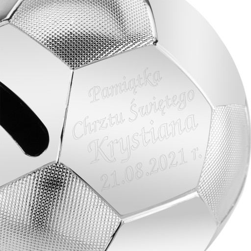 Skarbonka w kształcie piłki nożnej to znakomity pomysł na prezent z okazji Chrztu Świętego, roczku lub kolejnych urodzin. Chłopcy uwielbiają wszystko co związane jest z piłką, także na pewno taki prezent z pewnością sprawi radość obdarowanemu dziecku. Skarbonka posłuży na bardzo długi czas, gdyż od spodu znajduje się zatyczka do wyjmowania pieniążków.