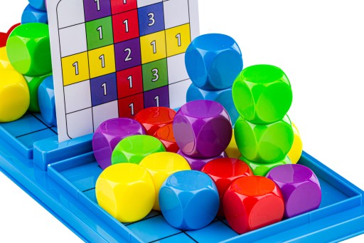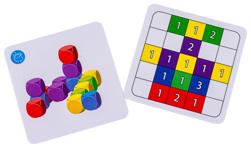 Dwa rodzaje kart to dwa stopnie trudności. Jeden widok kart to rzut z "góry" - zawiera kolory i ilość kostek do ułożenia. Drugi widok to 3D - jest trudniejszy - ponieważ w jednym rzędzie znajdują się kostki w mieszanych kolorach. To świetne ćwiczenie na postrzeganie przestrzenne.