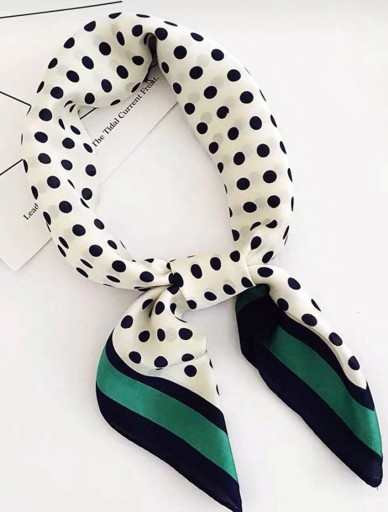 W zestawieniu kolorów ecru, zielonego oraz ciemnego granatu ze wzorem w groszki.
