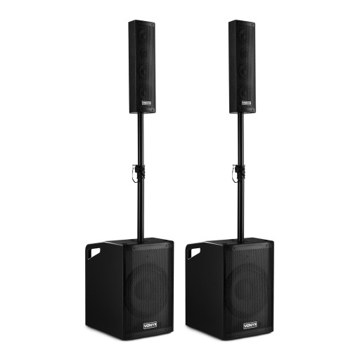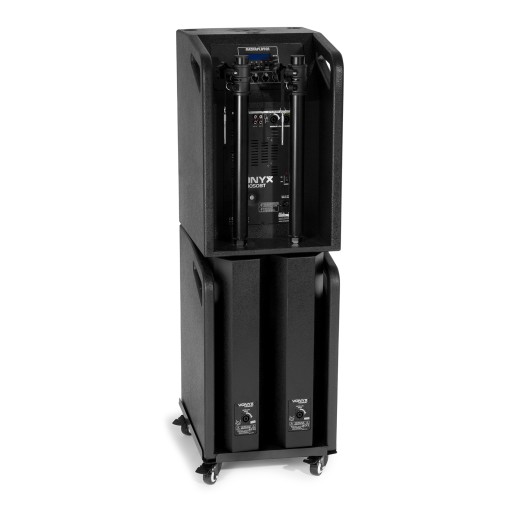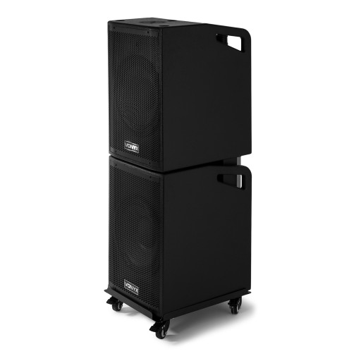 Bardzo łatwy do podłączenia system z minimalną liczbą kabli i bez osobnego sprzętu w postaci wzmacniaczy. Jeden z dwóch głośników niskotonowych jest aktywny, co oznacza, że ma wbudowany wzmacniacz. Ten wzmacniacz (2x 460W+ 2x 115W) steruje drugim głośnikiem niskotonowym i obydwoma górnymi. Kable do połączenia wszystkiego razem są w komplecie. Dzięki dostarczonym słupkom pośrednim oba głośniki górne można podnieść w celu lepszego rozprowadzenia dźwięku. Głośniki niskotonowe mają miejsce do przechowywania obu blatów i dwóch słupków pośrednich. Poręczny wózek platformowy i pokrowiec są dołączone do transportu i przechowywania, dzięki czemu cały zestaw można łatwo i bezpiecznie transportować i przechowywać.