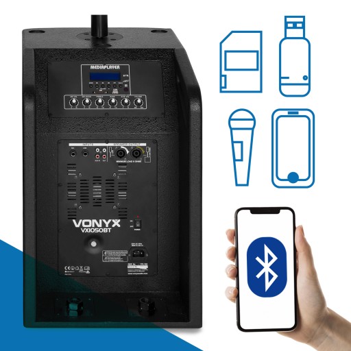 Pod względem łączności i możliwości VX1050BT niczego nie brakuje. Zestaw wyposażony jest w wewnętrzny odbiornik Bluetooth do bezprzewodowego połączenia między telefonem, tabletem itp. Wewnętrzny odtwarzacz MP3 umożliwia odtwarzanie muzyki MP3 bezpośrednio z pendrive'a lub karty SD. Wejście mikrofonowe jest dostępne do podłączenia urządzeń zewnętrznych, takich jak dostarczony mikrofon (w zestawie). Wejście i wyjście RCA AUX+ wejście liniowe jack 6,3mm jest dostępne do podłączenia sprzętu audio.