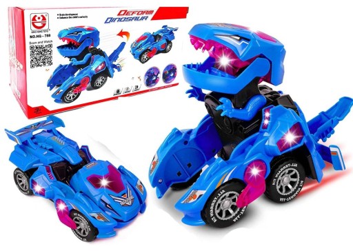 Transformujące auto robot dinozaur zachwyci niejednego chłopca, który kocha motoryzację. Autko podczas jazdy zmienia się w dinozaura i na odwrót. Samochód obraca się wokół władnej osi, a gdy napotka przeszkodę na swojej drodze odbija się od niej i jedzie dalej. Aby uatrakcyjnić zabawę dzieciom w zabawce zostały zamontowane kolorowe światełka, które mocno podświetlają samochód oraz efekty dźwiękowe miedzy innym ryk dinozaura. Ta zabawka z pewnością zachwyci każde dziecko.