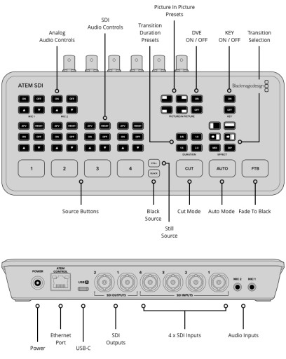 ATEM SDI jest szybki w konfiguracji i łatwy w obsłudze. Posiada 4 wejścia SDI z konwersją standardów, USB na kamerę internetową, 2 wyjścia SDI, mikser audio Fairlight z korektorem i dynamiką, DVE do obrazu w obrazie, efekty przejścia, kluczowanie chroma na zielonym tle, pulę multimediów na 20 kadrów dla nagłówków i darmowe oprogramowanie ATEM Software Control.