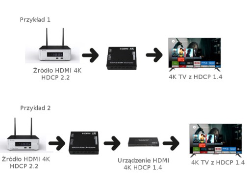 - Sprawdza się szczególnie w sytuacjach, gdy posiadamy starszy telewizor, który nie wspiera nowszego protokołu i nie chce wyświetlać obrazu HDMI z najnowszych urządzeń 4K tj. dekoderów, konsol , amplitunerów 4k@50/60Hz, odtwarzaczy Blu-ray 4k, Apple TV i innych. Otrzymujemy wtedy najczęściej komunikat o błędzie HDCP lub nawet brak sygnału na odbiorniku.