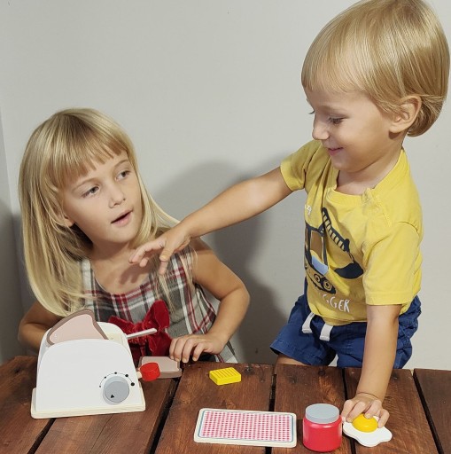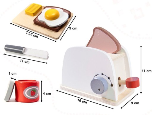 KREATYWNA ZABAWA – ten wyjątkowy zestaw śniadaniowy pozwoli Twojemu dziecku przygotować przepyszne danie. W skład zestawu wchodzi toster, kromki chleba tostowego, jajko sadzone, dżem, grillowany ser, nożyk oraz tacka. Urządzenie posiada regulację mocy oraz dźwignię. Wystarczy, że dziecko włoży tosty do tostera a następnie pociągnie za wajchę, a przepyszne chrupiące tosty wyskakują z urządzenia.