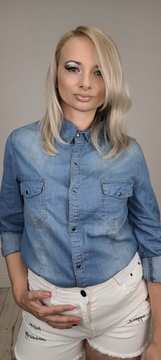 Klasyczna, ponadczasowa koszula jeans z kołnierzykiem. Zapinana z przodu na zatrzaski. Delikatnie taliowania, rękawy długie z mankietami zapinanymi na zatrzask.