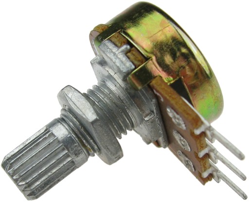 Potencjometr obrotowy liniowy B. Średnica: 16,9mm, średnica pokrętła: 6mm, długość gwintu: 6,5mm, długość oś + gwint: 15mm, piny do druku raster 5mm. Wartość potencjometru: 5K.