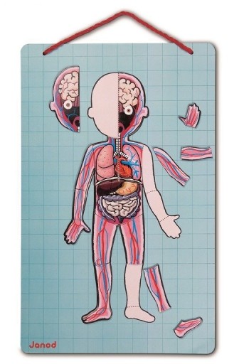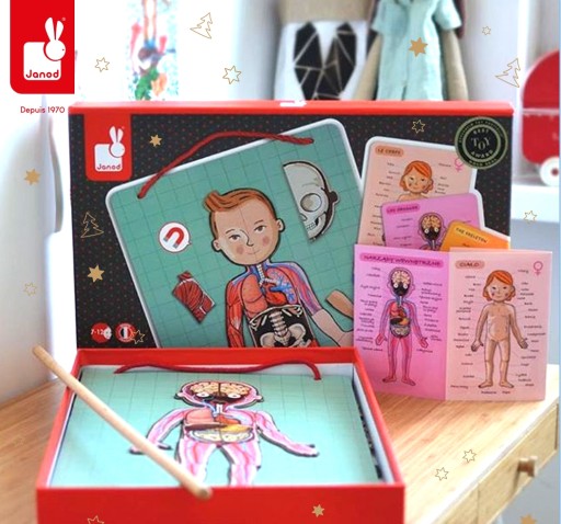 Układanka magnetyczna Ciało Człowieka francuskiej marki Janod to układanka edukacyjna, która nauczy Twoje dziecko budowy ludzkiego ciała w kilku językach m.in. polskim, angielskim, niemieckim, włoskim i hiszpańskim. Dzięki grze dziecko pozna nazwy części ciała, organów, kości i mięśni.