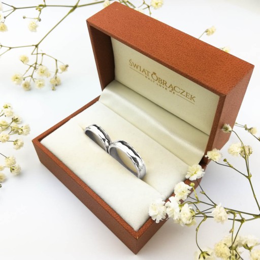 Obrączkę zapakujemy w eleganckie opakowanie zamykane wieczkiem z magnetycznym klipsem. Zewnętrzna strona wieczka sygnowana jest naszym logiem w kolorze złota, przepięknie mieniącym się w odbiciach światła. Wewnątrz pudełka znajduje się gąbeczka wykończona welurem.