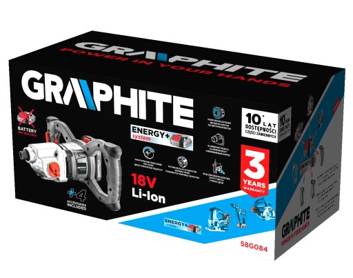 Mieszarka akumulatorowa GRAPHITE Energy+ (nr ref. 58G084) przeznaczona jest do mieszania farb, masy gipsowej i zapraw klejowych. Posiada płynną regulację obrotów oraz dwustopniową regulację prędkości obrotowej wrzeciona i włącznik z zabezpieczeniem, chroniącym przed przypadkowym uruchomieniem mieszarki. W zestawie znajdują się akcesoria: trzpień, mieszadło i dwa klucze do montażu.