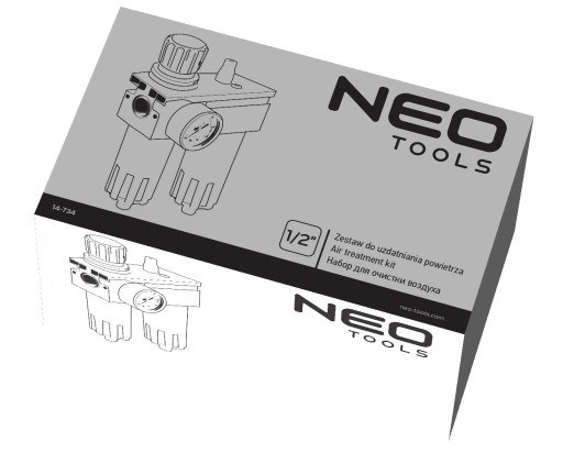 Zestaw do uzdatniania powietrza NEO (nr ref. 12-584) składa się z filtra, naolejacza oraz reduktora ciśnienia z manometrem. Stopień filtracji do 20 µm. Ciśnienie robocze do 12 bar. Funkcja półautomatycznego opróżniania zbiorniczka. Maksymalna przepustowość 2500 l/min., pojemność zbiorniczka na koncentrat 60 cm3. Filt pozwala zabezpieczyć narzędzia pneumatyczne przed zanieczyszczeniami. Przedłuża żywotność narzędzi pneumatycznych chroniąc je przed uszkodzeniami wodą ze sprężonego powietrza. Certyfikat CE potwierdza wysoką jakość produktu. Marka NEO spełnia oczekiwania profesjonalistów.