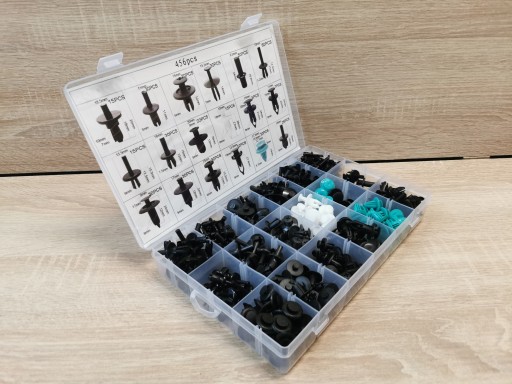 Duży zestaw spinek, kołków rozporowych oraz montażowych stosowanych we wszystkich najpopularniejszych markach samochodów. Zestaw składa się z 456el.