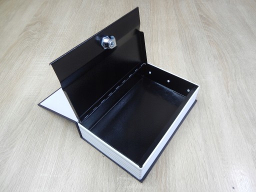 Kasetka w formie książki. W środku metalowy schowek. W komplecie dwa kluczyki. Wymiary zewnętrzne: 240 x 155 x 55 mm. Wymiary skrytki: 225 x 145 x 49 mm.