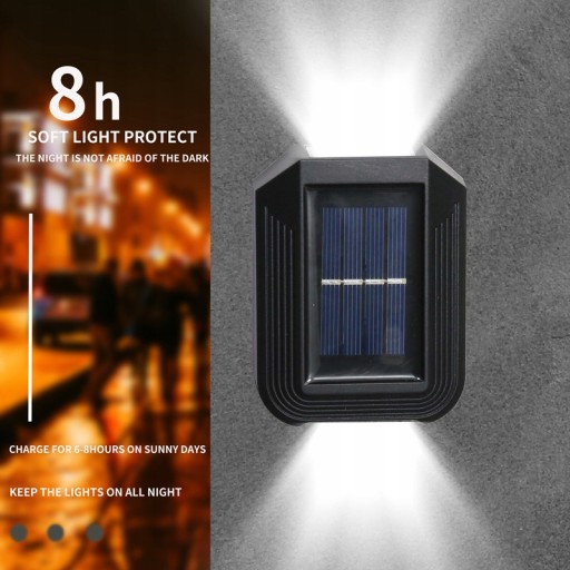 【自动开关机】上下两侧的LED灯在黑暗中会自动亮起。太阳能充满电 6 小时,灯可亮 8 小时。(充电和运行时间会因天气而异)。这种现代户外照明非常适合大门、门、人行道、车道、车库门、凉亭、露台、门廊、花园、栅栏、门、前门、楼梯等。