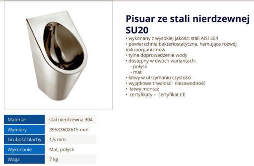 Pisuar ze stali nierdzewnej, przeznaczony do montażu natynkowego. Produkt przeznaczony zwłaszcza do toalet publicznych narażonych na możliwość uszkodzenia wyposażenia.
