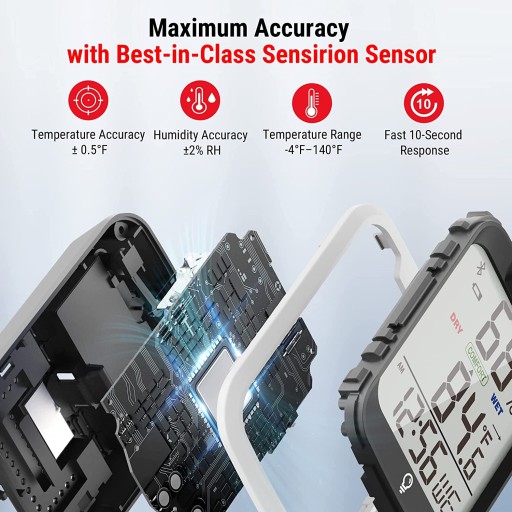 Dzięki wbudowanemu zaawansowanemu szwajcarskiemu czujnikowi wilgotności Sensirion miernik wilgotności jest bardzo dokładny do ±0.3°C dla temperatury i ±2% RH dla wilgotności; 10-sekundowe interwały szybkiego odświeżania zapewniają aktualizacje w czasie rzeczywistym najmniejszych zmian w domu. Pozwoli to monitorować wszystkie ważne miejsca np. warunki sypialni, szklarnia czy piwniczce. Temperatura wyświetlana jest w °C lub °F.