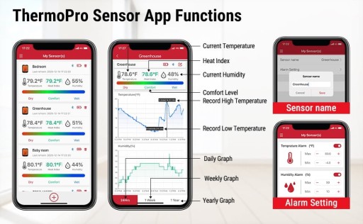 Natychmiastowy alert z aplikacji ThermoPro Sensor informuje, jeśli odczyty przekroczą ustawione poziomy temperatury i wilgotności.