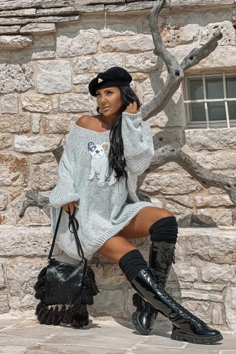 Przedłużany sweter oversize ZOCCO z naszywką pieska. Dzianina bardzo przyjemna w dotyku, skład: 70% akryl, 30% poliamid. SPRAWDŹ WYMIARY!