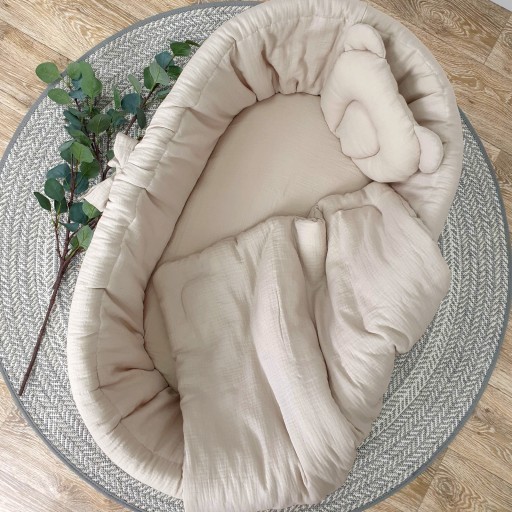 Muślinowa kołderka i poduszka w kolorze BEŻOWYM.