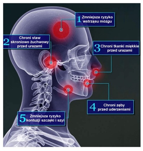 Ochraniacze na zęby wykonane z żelu który podczas formowania ochraniaczy idealnie dopasowuje się do kształtu uzębienia chroniąc je przed urazami podczas uderzeń.